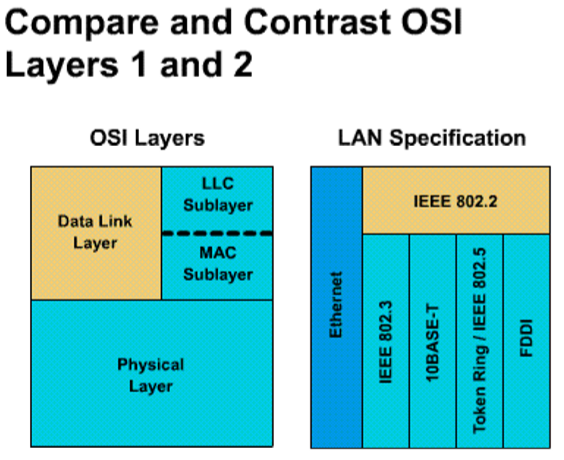 第一层 第二层 无法与上层通信 通过LLC (Logical Link Control) 与上层通信 无法确定哪台主机将会传输或接受二进制数据 通过MAC (Media Access Control) 确定 无法命名或识别主机 通过寻址(或命名)过程来实现 仅仅能描述比特流 通过帧来组织/分组比特